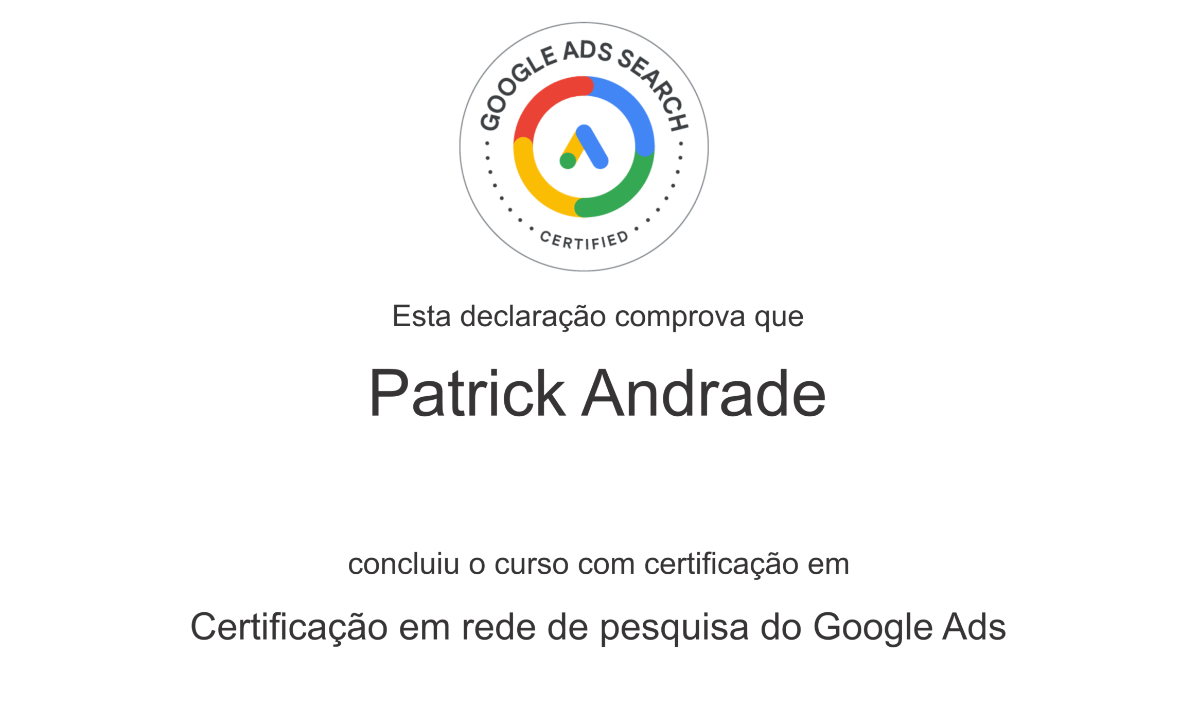 Meu principal objetivo é garantir que sua empresa alcance os melhores resultados. Para isso, estou sempre aprimorando minhas habilidades, com as maiores plataformas do Brasil. Além disso, faço parte do seleto grupo dos profissionais que foram certificados e aprovados pelo Google Redes de Pesquisa.